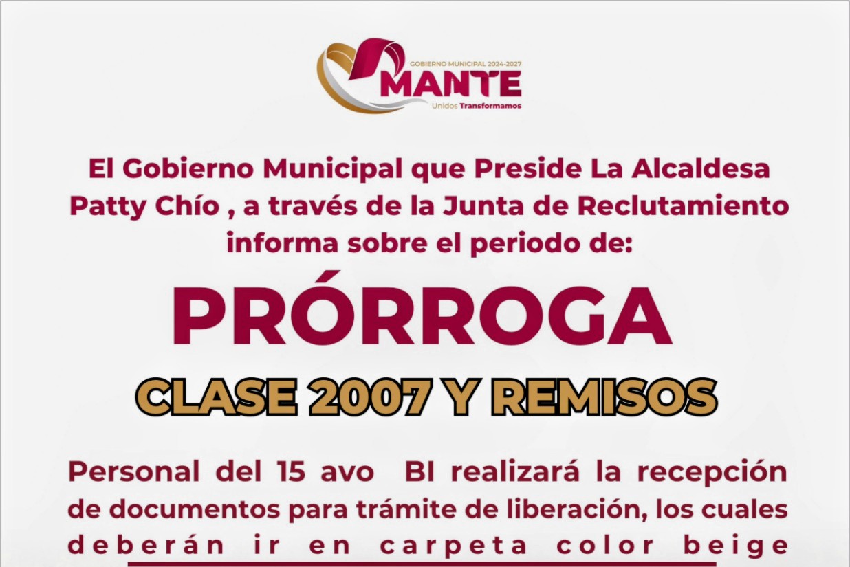 El Mante Tamauliipas, México / Enero 30 de 2026 / El Ayuntamiento presidido por la licenciada Martha Patricia Chío de la Garza, anunció una extensión en el plazo para que los jóvenes en edad militar pertenecientes a la Clase 2007 y remisos realicen el trámite de liberación de su Cartilla del Servicio Militar Nacional.
