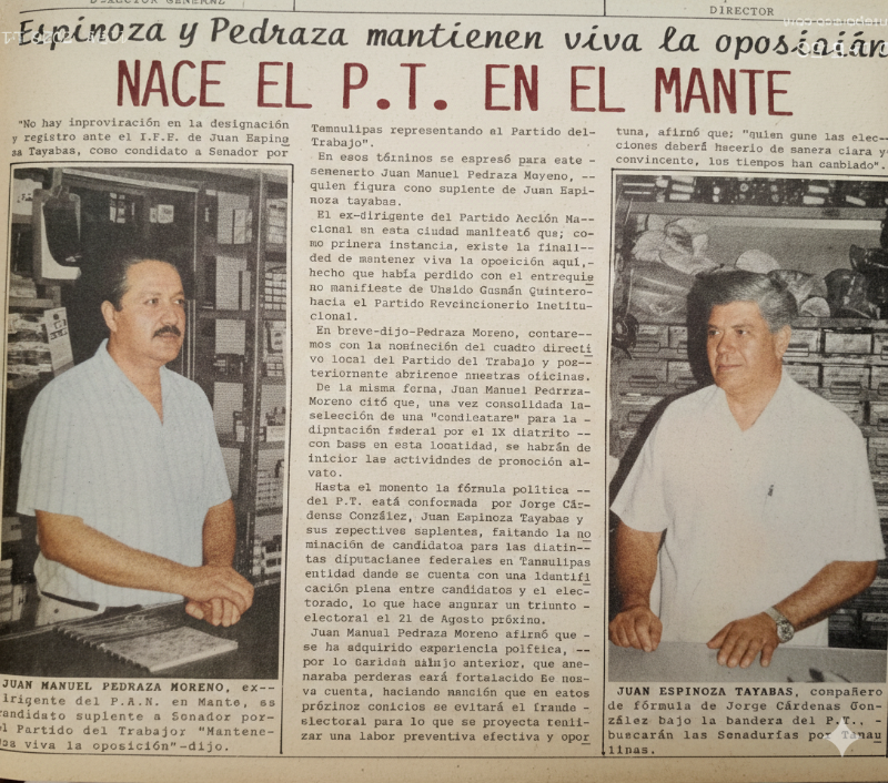 Izquierda: JUAN MANUEL PEDRAZA MORENO, ex-dirigente del P.A.N. en Mante, es candidato suplente a Senador por el Partido del Trabajo. «Mantenga viva la oposición», dijo.