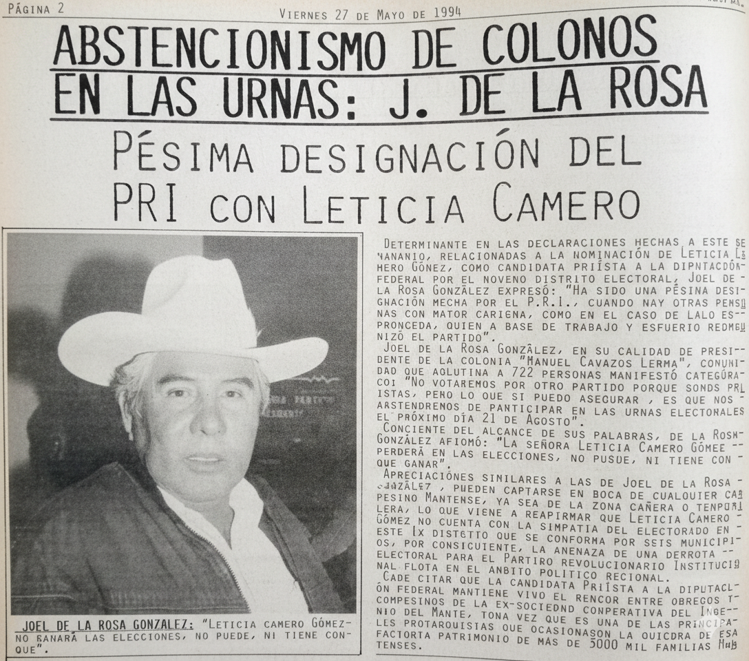 Ciudad Mante, Tamaulipas / 27 de Mayo de 1994 / «Abstencionismo de colonos en las urnas»: J. de la Rosa.